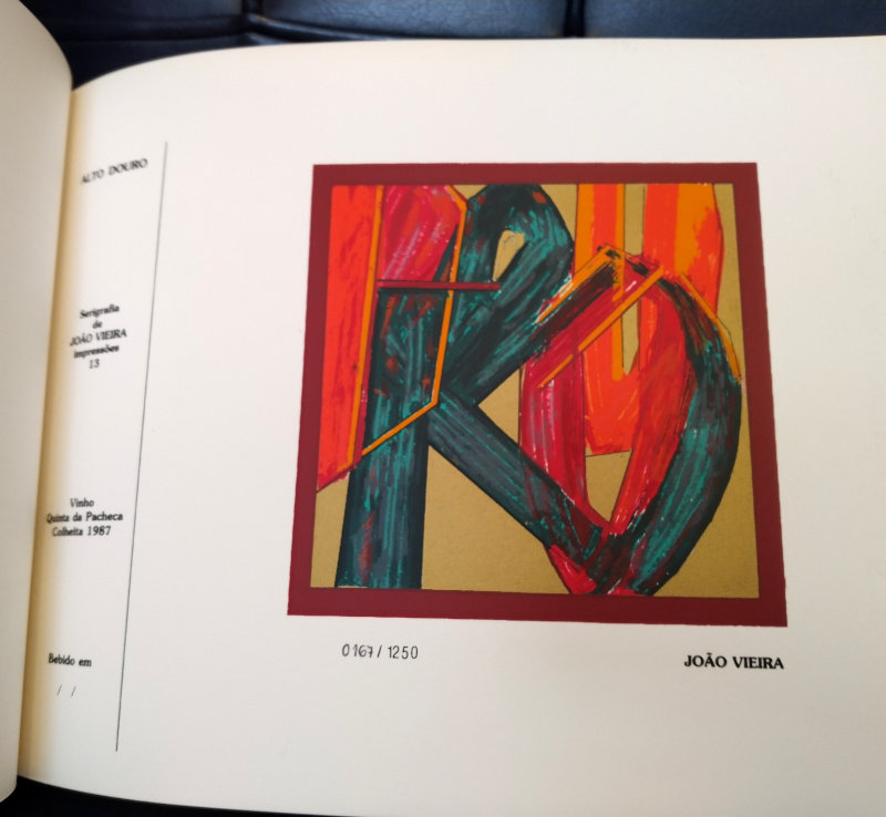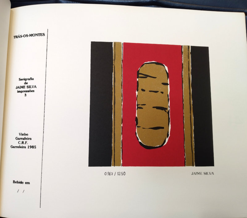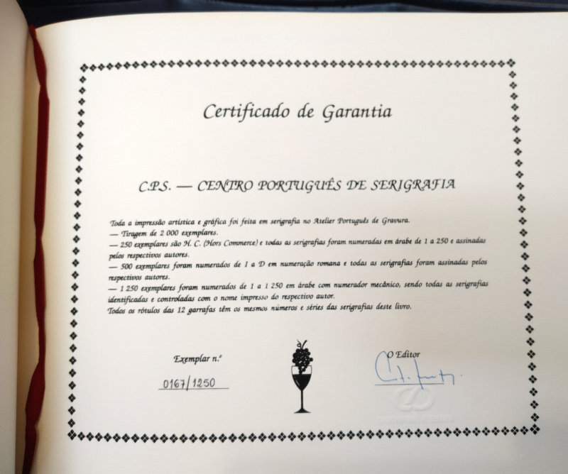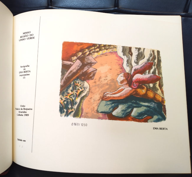 Livro com doze serigrafias das quais nasceram os rótulos para os vinhos de doze províncias portuguesas que compõem a coleção "Arte e o Vinho" do CPS. Artistas (e província): Ema Berta (Minho), Jaime Silva (Trás-os-Montes), João Vieira (Alto Douro), Isabel Laginhas (Douro Litoral), Mário Rita (Beira Alta), Nicolau Tudela (Beira Baixa), Gracinda Candeias (Beira Litoral), Mimi (Estremadura), Rico Sequeira (Ribatejo), Espiga Pinto (Alto Alentejo), Eurico Gonçalves (Baixo Alentejo), Manuel Baptista (Algarve).