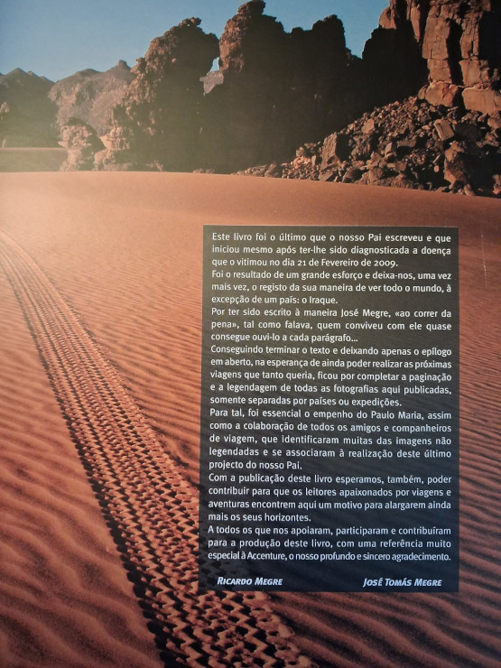 «Este livro foi o último que o nosso Pai escreveu e que iniciou mesmo após ter-lhe sido diagnosticada a doença que o vitimou no dia 21 de Fevereiro de 2009. Foi o resultado de um grande esforço e deixa-nos, uma vez mais vez, o registo da sua maneira de ver todo o mundo, à excepção de um país: o Iraque. Por ter sido escrito à maneira de José Megre, «ao correr da pena», tal como falava, quem viveu com ele quase consegue ouvi-lo cada parágrafo. Conseguindo terminar o texto e deixando apenas o epílogo em aberto, na esperança de ainda poder realizar as próximas viagens que tanto queria, ficou por completar a paginação e a legendagem de todas as fotografias aqui publicadas, somente separadas por países ou expedições. Para tal, foi essencial o empenho do Paulo Maria, assim como a colaboração de todos os amigos e companheiros de viagem, que identificaram muitas das imagens não legendadas e se associarem à realização deste último projecto do nosso pai. Com a publicação deste livro esperamos, também, poder contribuir para que os leitores apaixonados por viagens e aventuras encontrem aqui um motivo para alargarem ainda mais os seus horizontes. A todos os que nos apoiaram e contribuíram para a produção deste livro, com uma referência muito especial à Accenture, o nosso profundo e sincero agradecimento.» Ricardo Megre e José Tomás Megre