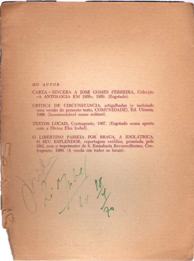«À Comunidade, estendida na cama, vê-se-lhe o peito subir e descer, está viva. Seio nu, moleirinha latejante, Lina, Paulo Eduardo, são peças do mecanismo uno e orgânico. Cresce o texto, alimentado pela vida da Comunidade, alimentação recíproca. Brota a vida de dentro dos corpos, respira por cinco pulmões, quatro corações jovens, segura-a uma mão-âncora de carne. O corpo é uma coisa tão velha como a humanidade, não há que escondê-lo, começa aí a liberdade. A miúda deitada de punhos cerrados já a adivinhar ideais.»