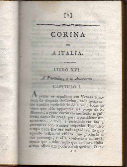 A história de amor entre Corina, uma poetisa italiana e um aristocrata inglês. Madame de Staël descreve em detalhe a Itália, sua história, seus costumes e sua cultura.