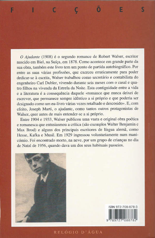 O Ajudante (1908) é o segundo romance de Robert Walser, escritor nascido em Biel, na Suíça, em 1878. Como acontece em grande parte da sua obra, também este livro tem um ponto de partida autobiográfico. Por entre as suas várias profissões, que exerceu erraticamente para poder dedicar-se à escrita, Walser trabalhou como secretário e contabilista do engenheiro Carl Dubler, vivendo durante seis meses com o casal e quatro filhos na vivenda da Estrela da Noite. Esta contiguidade entre a vida e a literatura é a consequência daquele «romance que nunca deixei de escrever, que permanece sempre idêntico a si próprio e que poderia ser designado como um eu-livro várias vezes retalhado e descosido». E, com efeito, Joseph Marti, o ajudante, como tantos outros protagonistas de Walser, quer antes de mais entender-se a si próprio. Entre 1904 e 1933, Walser publicou uma vasta e original obra poética e romanesca que entusiasmou a crítica (são exemplos Walter Benjamin e Max Brod) e alguns dos principais escritores de língua alemã, como Hesse, Kafka e Musil. Em 1929 ingressou voluntariamente num manicómio. Foi encontrado morto, na neve, por um grupo de crianças no dia de Natal de 1956, quando dava um dos seus habituais passeios.